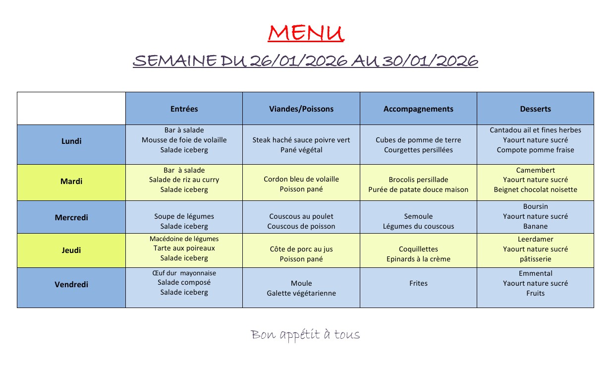 Menus du 26 janvier au 30 janvier 2026
